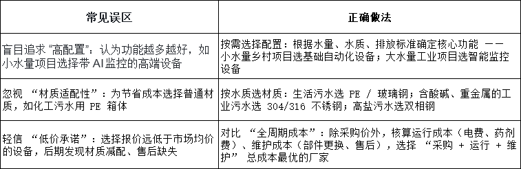 企業(yè)在選擇成套污水處理設(shè)備時,易陷入 “只看采購價、忽視長期成本”“盲目追求高端配置” 等誤區(qū),需從 “需求匹配、成本核算、風險規(guī)避” 三個維度科學選型:
